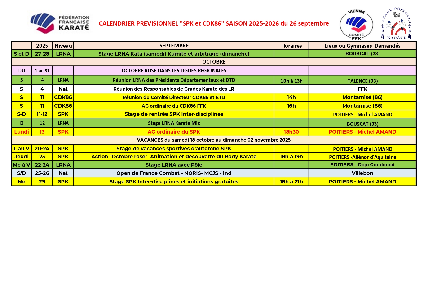 CALENDRIER DE LA SAISON